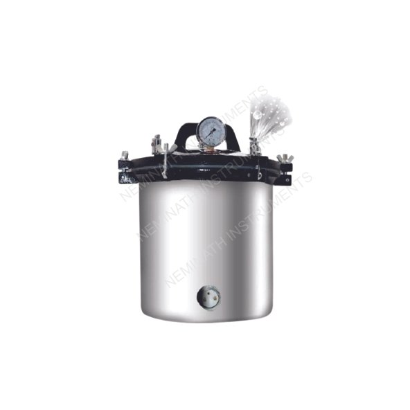 A Labmate portable pressure steam sterilizer is a top-loading steam autoclave with a heavy-duty stainless steel chamber, tamper-proof lid, pressure/temperature indicators, and safety systems (pressure relief valve). It utilizes high-pressure steam at ~126 °C for effective sterilization. The compact footprint makes it ideal for labs, clinics, and mobile sites where larger units are not feasible.