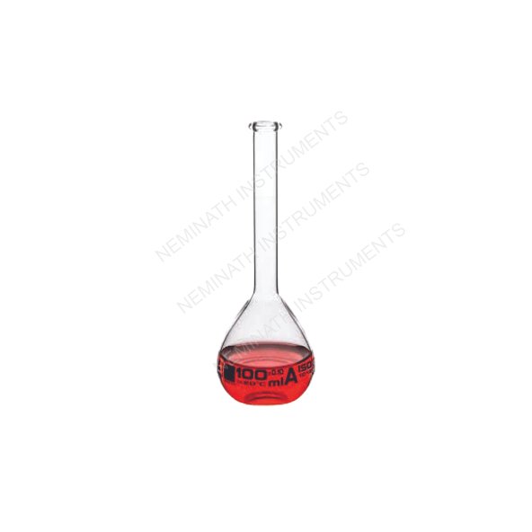 Volumetric flasks are manufactured from high-quality, low expansion Borosilicate Glass 3.3. They have a pear-shaped body with a long narrow neck and a single calibration mark etched on the neck for precise volume measurement.