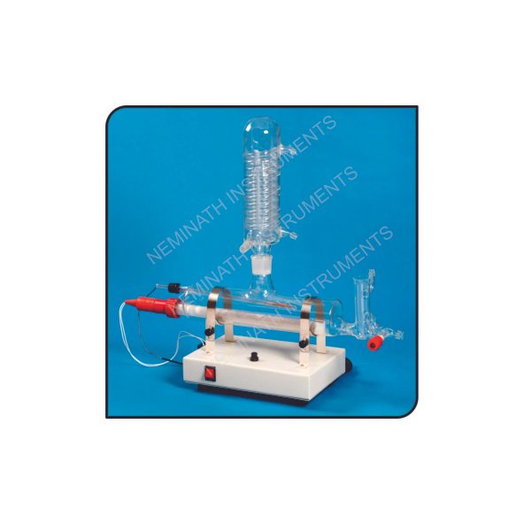 Description :- Water Distillation units are carefully designed to produce high purity pyrogen free distilled water. The unit is made up of Borosilicate glass, Horizontal type Boiler, Condenser, Silica Sheathed Quartz Heater along with Stand and clamps. Key Features :-  Replaceable Silica Heaters : Boiler is fitted with a removable Silica Sheathed(Quartz) Heater and Screw. Threaded Connector for ease of cleaning when scaling is formed inside.  Distillate temperature is around 25 to 45°C which is ensure by an efficient condenser.  The Stand is powder coated for rust free operation and elegant appearance.  The Unit automatically switches off If the water level in the boiler falls below heater.  Cooling water from Condenser is re-circulated into the boiling chamber which saves the energy.